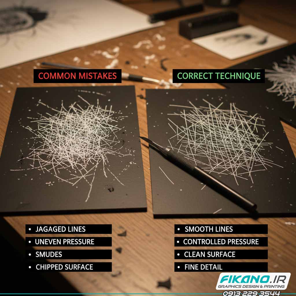 هر ناحیه از اثر باید از نظر شدت خراش، تراکم خطوط و زاویهی آنها تحلیل شود تا تصویر طبیعی و منسجم باقی بماند.